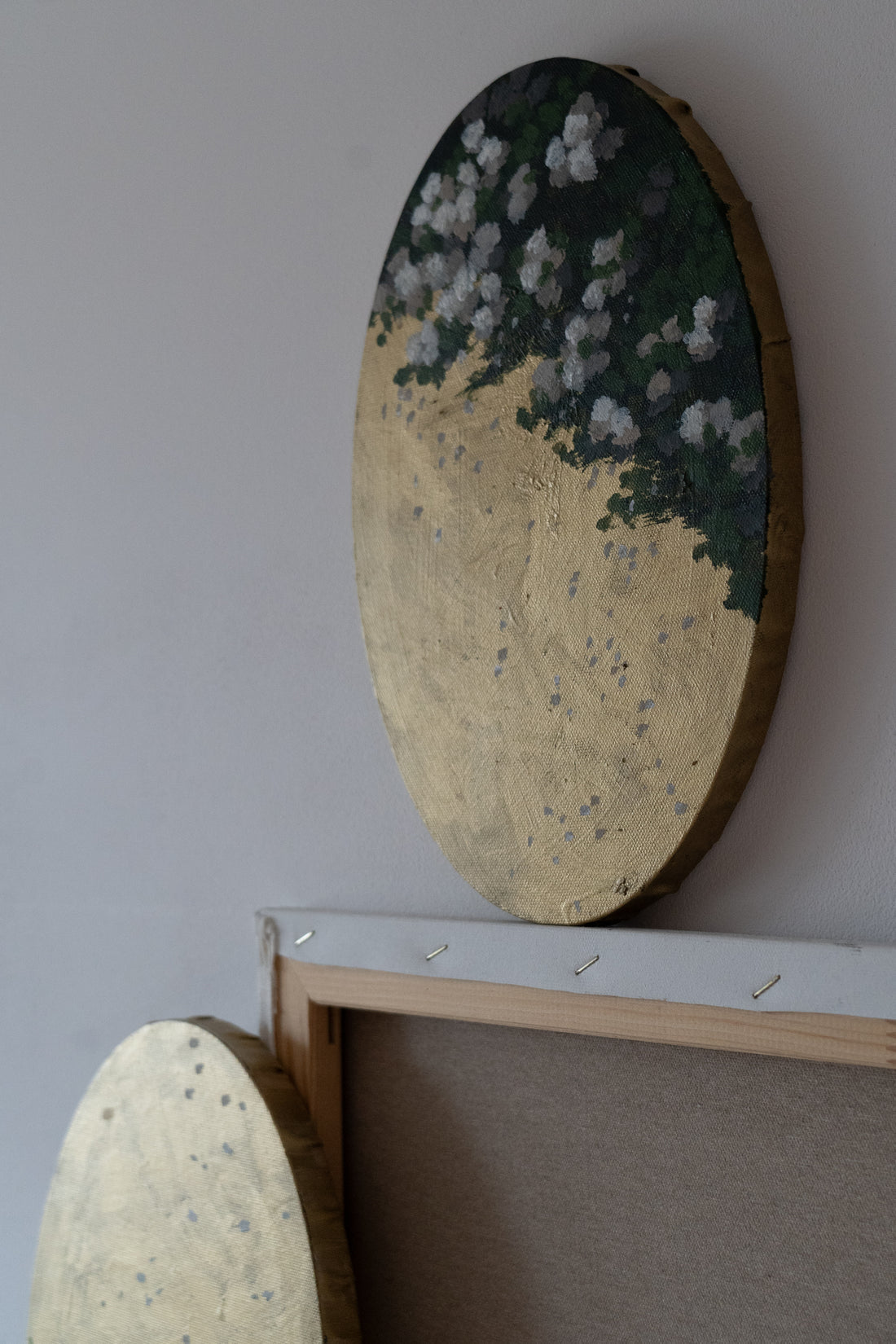 Acrylic on canvas; oval 20 x 30 cm ( 7,9 x 11,8 inch ) The painting is protected with a satin varnish.